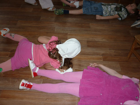 Выбираются по одному радисту из числа участников. Они должны по-пластунски доползти до линии, где лежит «разорванный провод» Две тонкие ленточки одного цвета). Задача радиста – соединить (связать) между собой разорванные концы «провода».Кто справится быстрее, получает для команды 2 очка.